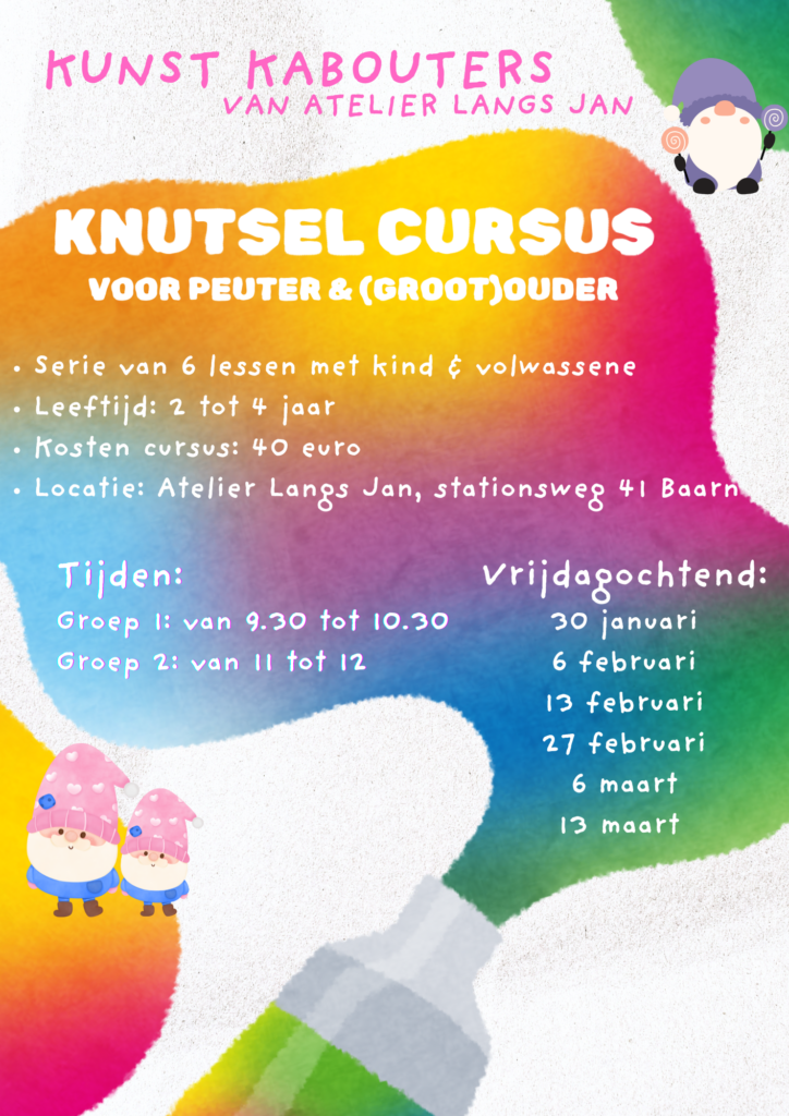 In 2026 starten we met cursussen voor peuters & (groot)ouders samen. Kom gezellig samen experimenteren met o.a. klei, verf en drukkunst en ontmoet kunstkabouter Jan!